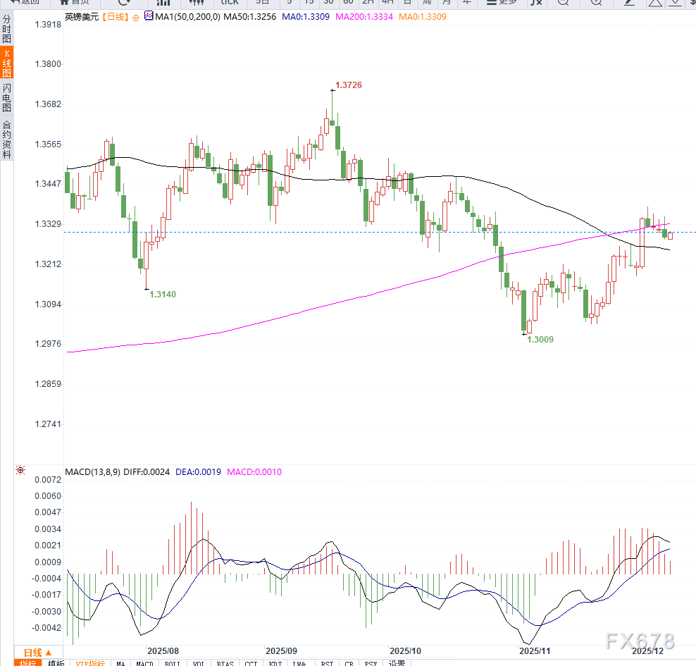 短期来看,GBP/USD 在好意思联储鹰派降息与英央行潜在降息之间处于拉锯状况。从日线图来看,GBP/USD 正处于 1.3250–1.3350 区间整理结构。价钱鄙人方 1.3250 隔邻获取支抓,上方 1.3350–1.3380 区域酿成压力带。